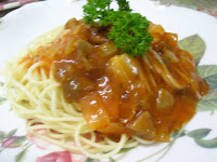 * Didihkan air.Spageti di rebus selama 10 minit.Angkat, basuh dan toskan. Ambil satu sudu minyak , gaul rata.